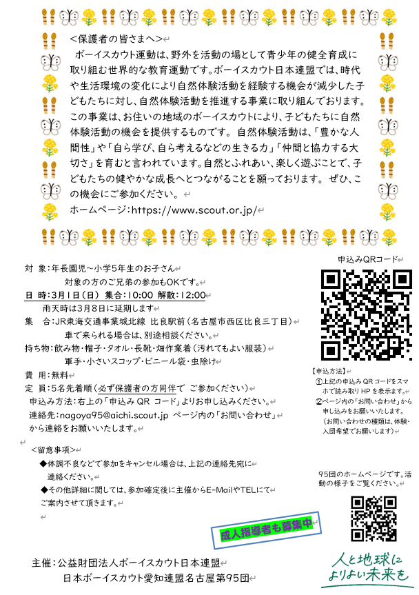 2026年2月23日 2026年3月1日 体験会を行います。 By サイト管理者 に カブ隊, ビーバー隊, 団委員 タグ カブスカウト, ビーバースカウト, ボーイスカウト, 体験, 名古屋市, 小学生, 幼児教育, 芋の植え付け, 野菜の収穫